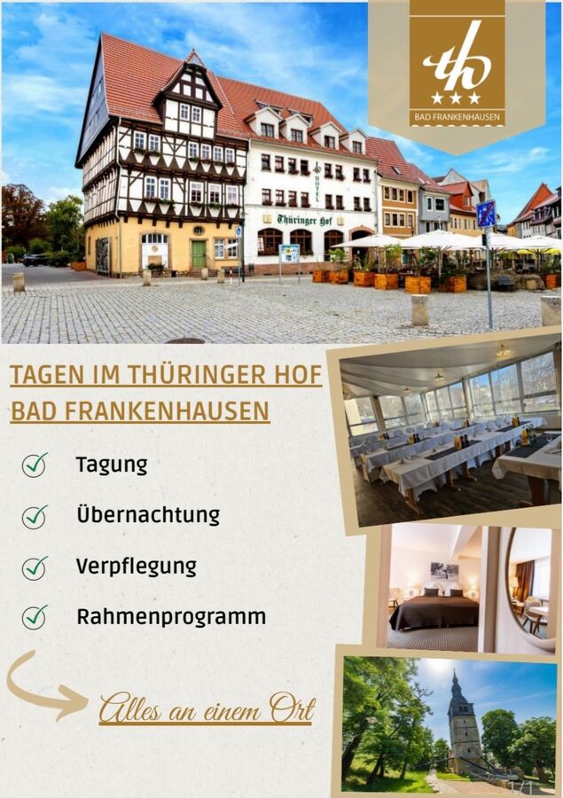 Der Thüringer Hof bietet den perfekten Rahmen für erfolgreiche Tagungen und Seminare. Nach einem produktiven Arbeitstag können Sie in und um Bad Frankenhausen zahlreiche Sehenswürdigkeiten entdecken. Historische Bauwerke, kulturelle Highlights und die reizvolle Natur der Region machen Ihr Tagungsprogramm abwechslungsreich und unvergesslich.